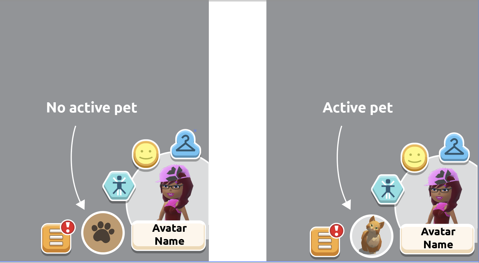 Potrai vedere tutti i tuoi animali domestici cliccando il pulsante speciale Animale domestico accanto al nome del tuo avatar. Se non hai animali domestici equipaggiati, verrà mostrata un'impronta di zampa. Se hai un animale domestico attivo, verrà mostrato un piccolo avatar dell'animale.