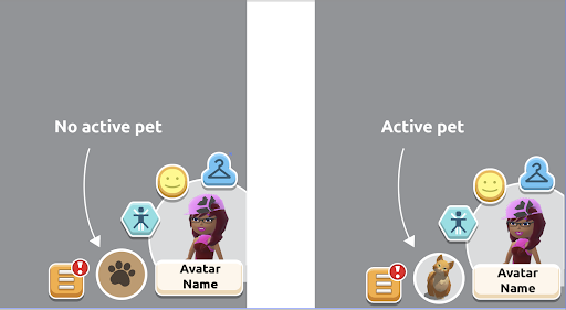 アバター名の横にある特別なペットボタンを押すと、自分のペットをすべて確認できます。ペットを装備していない場合は、肉球のマークが表示されます。アクティブなペットがいる場合は、そのペットの小さなアバターが表示されます。